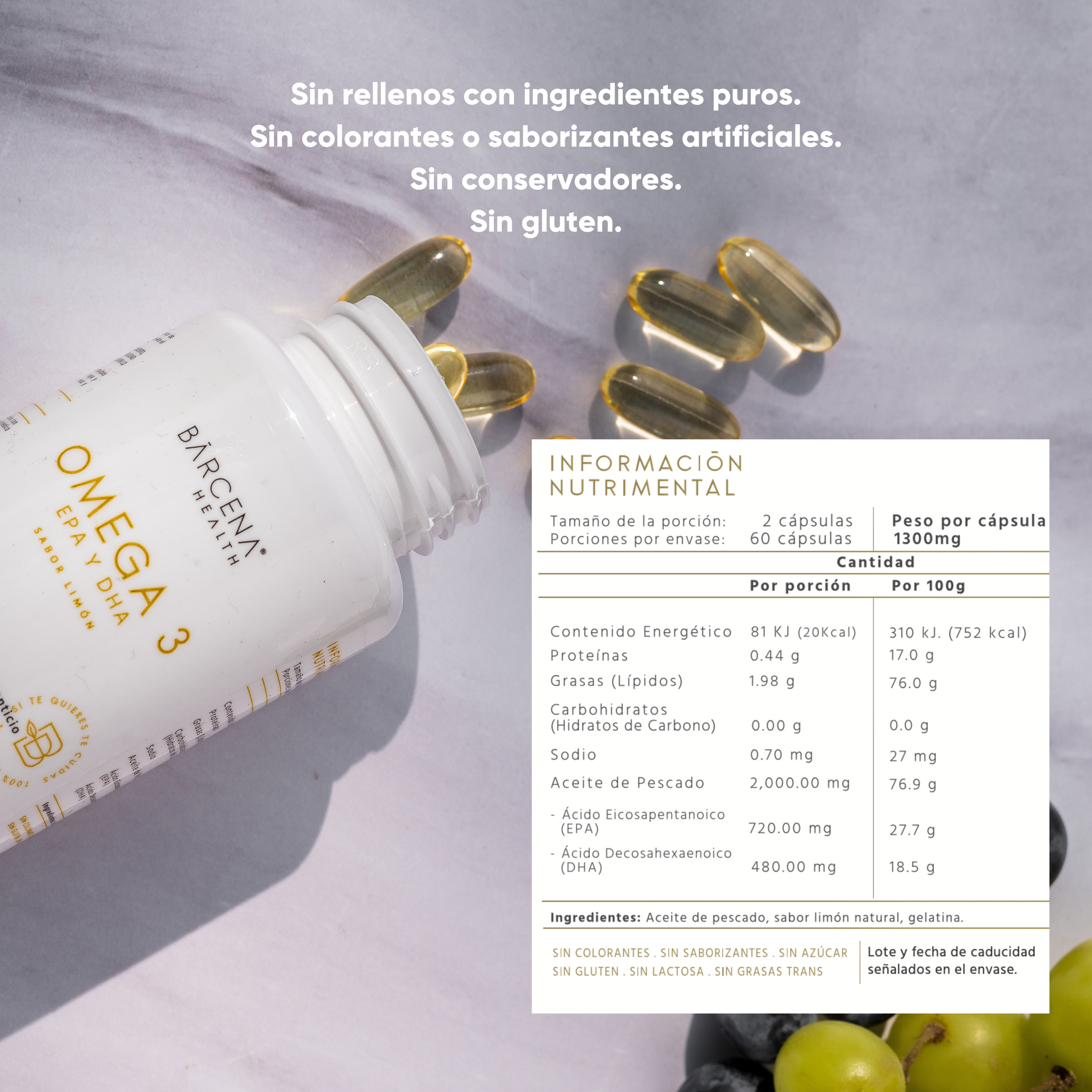 - 1 bote de 60 cápsulas de Omega 3 con 2000mg (720mg EPA y 480 mg DHA). Checa más info aquí