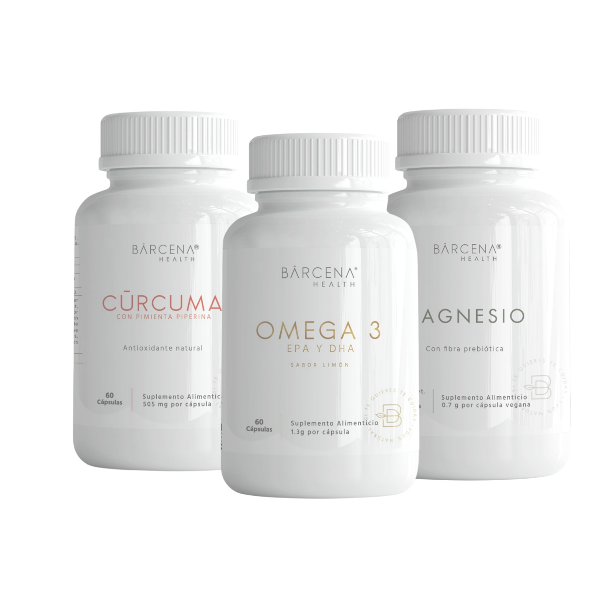 El Functional Kit Bárcena Health es una combinación perfecta de Cúrcuma Pura, Omega 3 (DHA y EPA) y Glicinato de Magnesio, diseñado para quienes buscan un enfoque integral en salud funcional. Este kit está formulado con ingredientes limpios, puros y veganos, ofreciendo una solución natural para el bienestar cardiovascular, articular, muscular y metabólico.